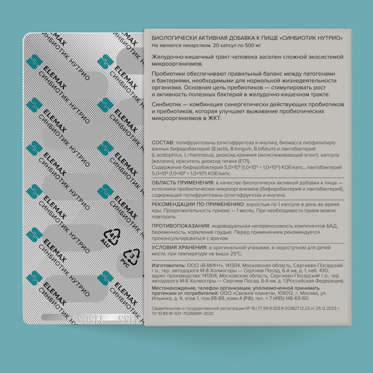 Полифруктозаны (олигофруктоза и инулин), биомасса лиофилизированных бифидобактерий (B.lactis, B.longum, B.bifidum) и лактобактерий (L.acidophilus, L.rhamnosus), аэросил (антислеживающий агент), желатин, Е171 или целлюлоза (капсула). Содержание бифидобактерий 5,0×109 (1,0×109 ÷ 1,0×1010) КОЕ/капс., лактобактерий 5,0×108 (1,0×108 ÷ 1,0×109) КОЕ/капс.